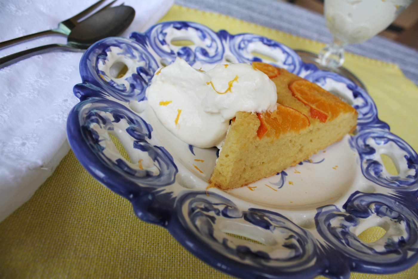 I resist even calling this treat a cake. More like a hearty cornbread and not sickly sweet, it would make an impressive addition to a brunch table or go perfectly with tea or coffee as a mid-afternoon pit stop. Don’t be afraid to leave the skins on the fruit. Once they are sliced paper thin and cooked in a crust of “sugar,” they become tender and the slight bitterness really balances out the recipe. Mandarins would work well here too – or even lemons as a treat to serve with a sip of limoncello or glass of prosecco by the pool! Finally, again more balanced than sweet, a healthy dollop of tangy yogurt sauce makes a luscious foil to the cake’s crumbled texture.